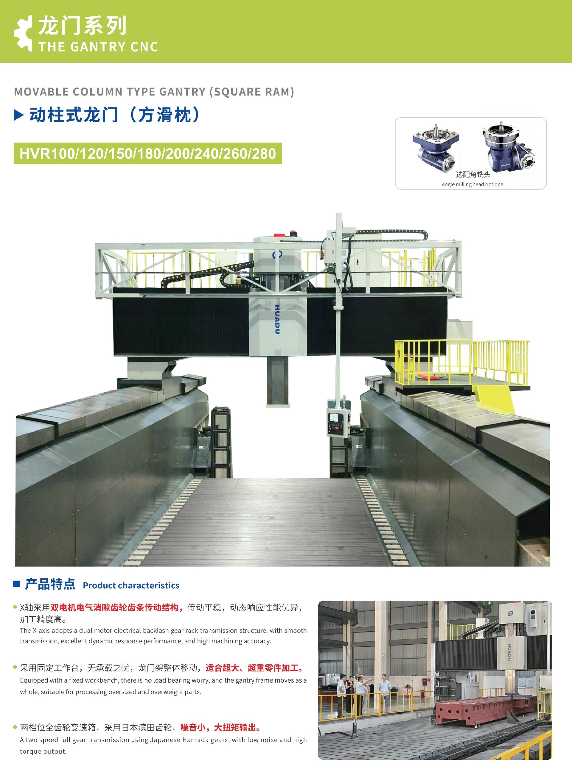 X軸采用雙電機(jī)電氣消隙齒輪齒條傳動(dòng)結(jié)構(gòu),傳動(dòng)平穩(wěn),動(dòng)態(tài)響應(yīng)性能優(yōu)異,加工精度高;采用固定工作臺(tái),無(wú)承載之憂(yōu),龍門(mén)架整體移動(dòng),適合超大、超重零件加工;兩檔位全齒輪變速箱,采用日本濱田齒輪,噪音小,大扭矩輸出