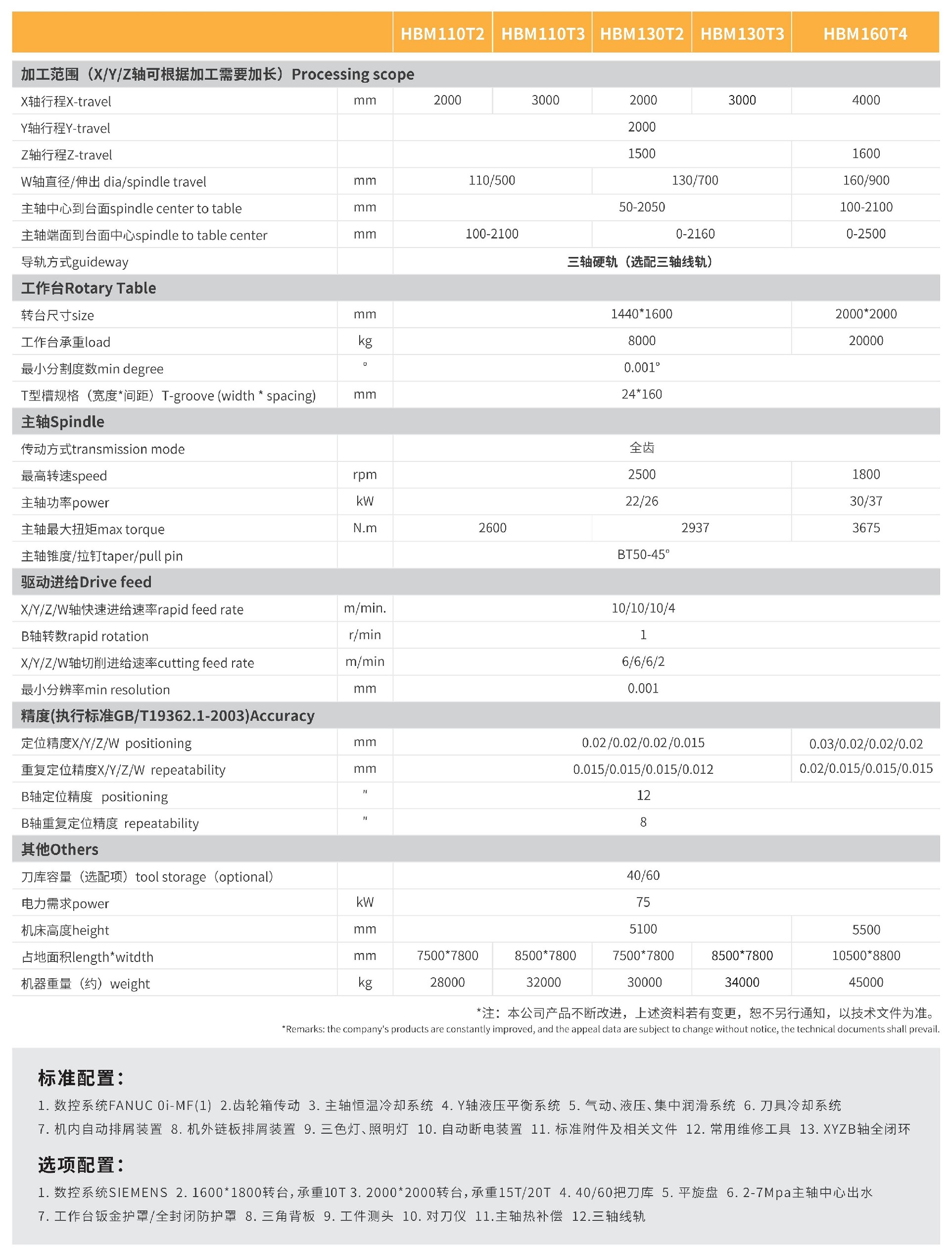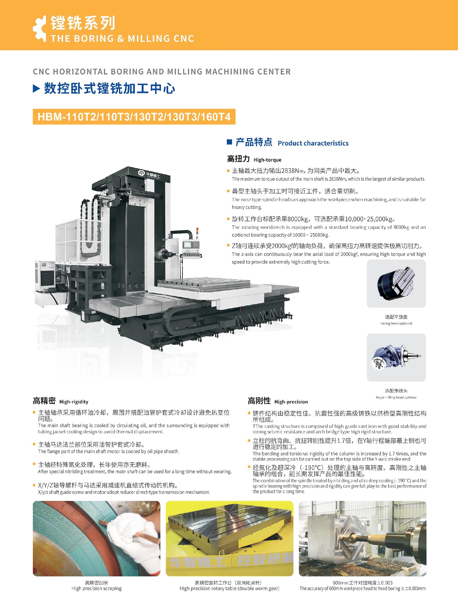 高扭力:主軸最大扭力輸出2838NM,為同類產(chǎn)品中最大;鼻型主軸頭于加工時(shí)可接近工件,適合耐重切削;旋轉(zhuǎn)工作臺(tái)標(biāo)配承重8000kg,可選配承重10,000~25,000kg;Z軸可連續(xù)承受2000kgf的軸向負(fù)荷,確保高扭力高轉(zhuǎn)速提供極高切削力;高精度:主軸軸承采用循環(huán)油冷卻,周圍并搭配油管護(hù)套式冷卻設(shè)計(jì)避免熱變位問題;主軸馬達(dá)法蘭部位采用油管護(hù)套式冷卻;主軸經(jīng)特殊氮化處理,長(zhǎng)年使用亦無(wú)磨耗;X/Y軸導(dǎo)螺桿與馬達(dá)采用直結(jié)式傳動(dòng)的機(jī)構(gòu);高剛性:鑄件結(jié)構(gòu)由穩(wěn)定性佳、抗震性強(qiáng)的高級(jí)鑄鐵以拱橋型高剛性結(jié)構(gòu)所組成;立柱的抗彎曲、抗扭轉(zhuǎn)剛性提升1.7倍,在Y軸行程端部最上側(cè)也可進(jìn)行穩(wěn)定的加工;經(jīng)氮化及超深冷(-190℃)處理的主軸與高精度、高剛性之主軸軸承的組合,能長(zhǎng)期發(fā)揮產(chǎn)品的最佳性能;