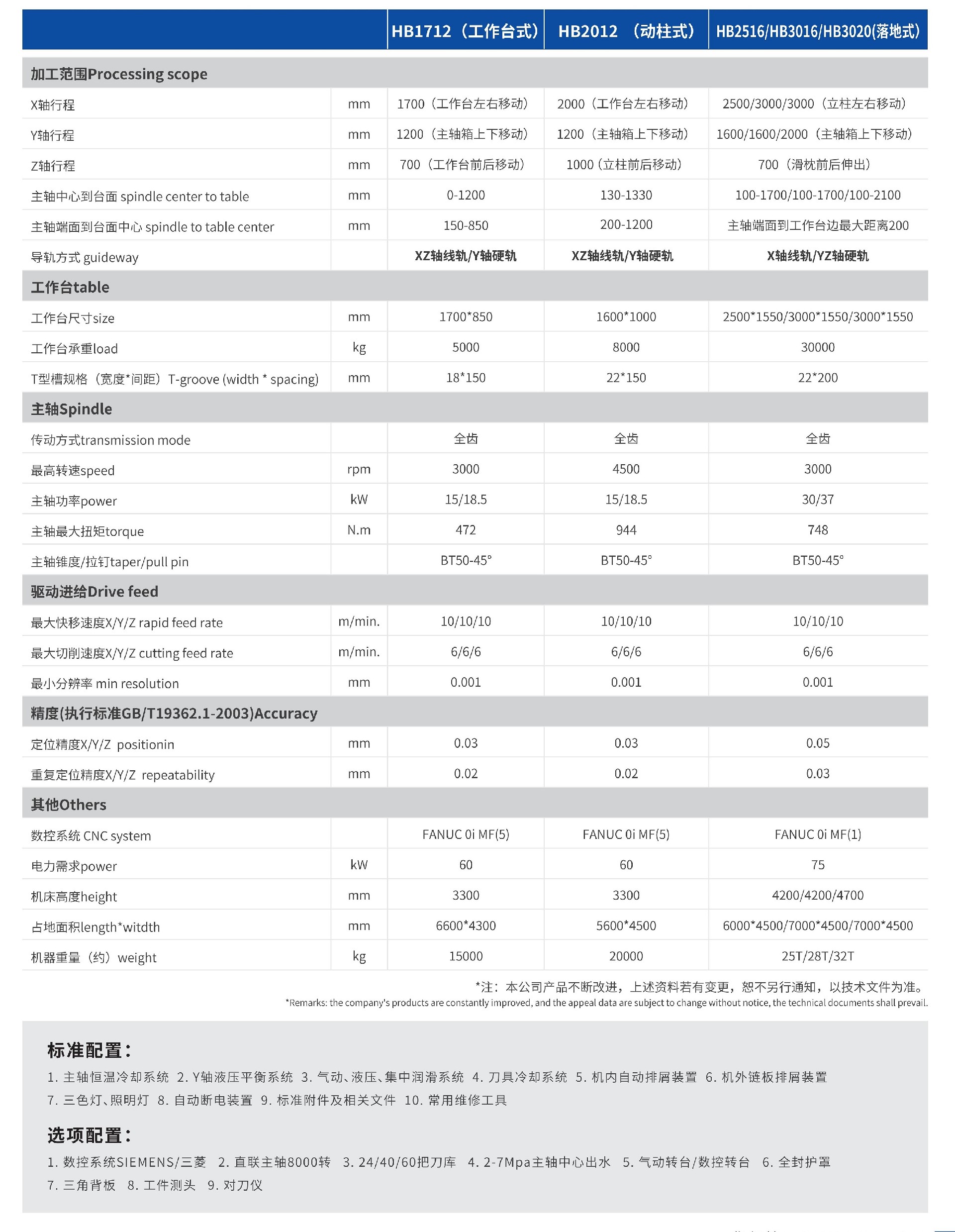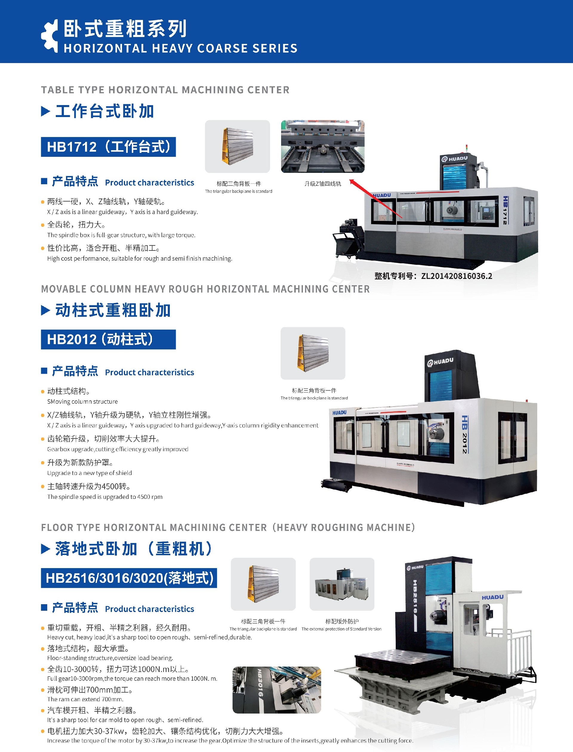 工作臺(tái)式:兩線一硬,X、Z線軌,Y軸硬軌;全齒輪,扭力大;性價(jià)比高,適合開(kāi)粗、半精加工;動(dòng)柱式:動(dòng)柱式結(jié)構(gòu);X/Z軸線軌,Y軸升級(jí)為硬軌,Y軸立柱剛性增強(qiáng);齒輪箱升級(jí),切削效率大大提升;升級(jí)為新款防護(hù)罩;軸轉(zhuǎn)速升級(jí)為4500轉(zhuǎn);落地式:重切重載,開(kāi)粗、半精之利器,經(jīng)久耐用;落地式結(jié)構(gòu),超大承重;全齒10-3000轉(zhuǎn),扭力可達(dá)1000N.m以上;滑枕可伸出700mm加工;汽車模開(kāi)粗、半精之利器;電機(jī)扭力加大30-37kw,齒輪加大、鑲條結(jié)構(gòu)優(yōu)化,切削力大大增強(qiáng);